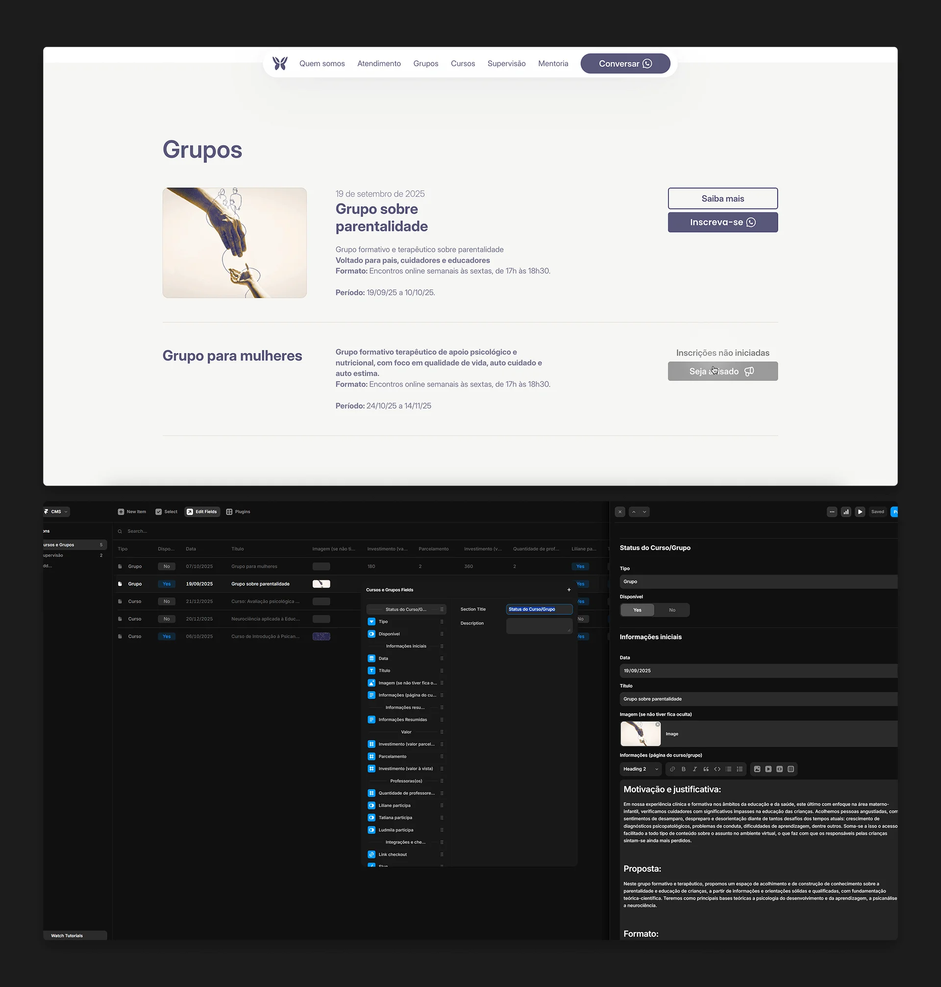 CMS in Framer to dynamically manage groups, supervision sessions, and courses, fully integrated into the homepage. When spots are available, users are directed to an individual page with complete information and a registration CTA; when not, the flow presents a waiting list form. The CMS management is simple, organized, and automated, keeping the entire website integrated and up to date.