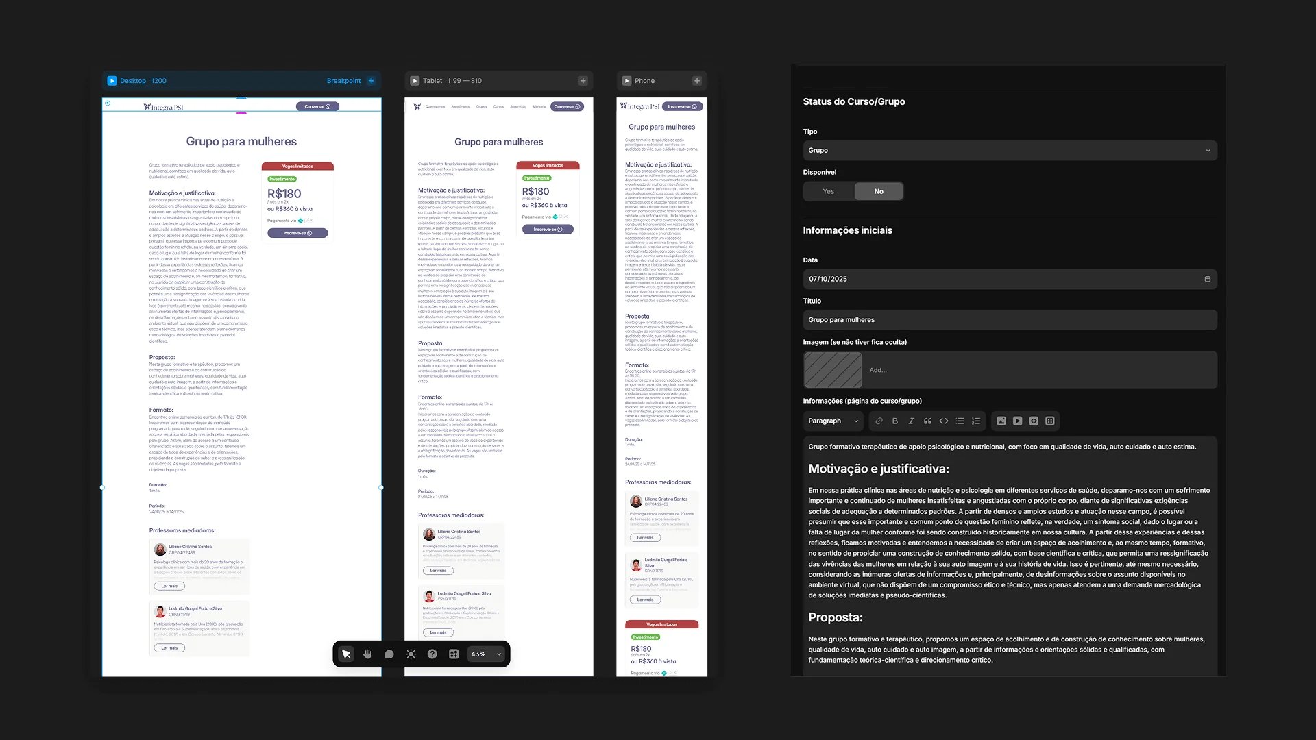 CMS no Framer para gerenciar dinamicamente grupos, supervisões e cursos, totalmente integrado à home. Quando há disponibilidade, o usuário é direcionado para a página individual com informações completas e CTA de inscrição; quando não há, o fluxo já apresenta um formulário de lista de espera. O gerenciamento do CMS é simples, organizado e automatizado, mantendo todo o site integrado e atualizado.