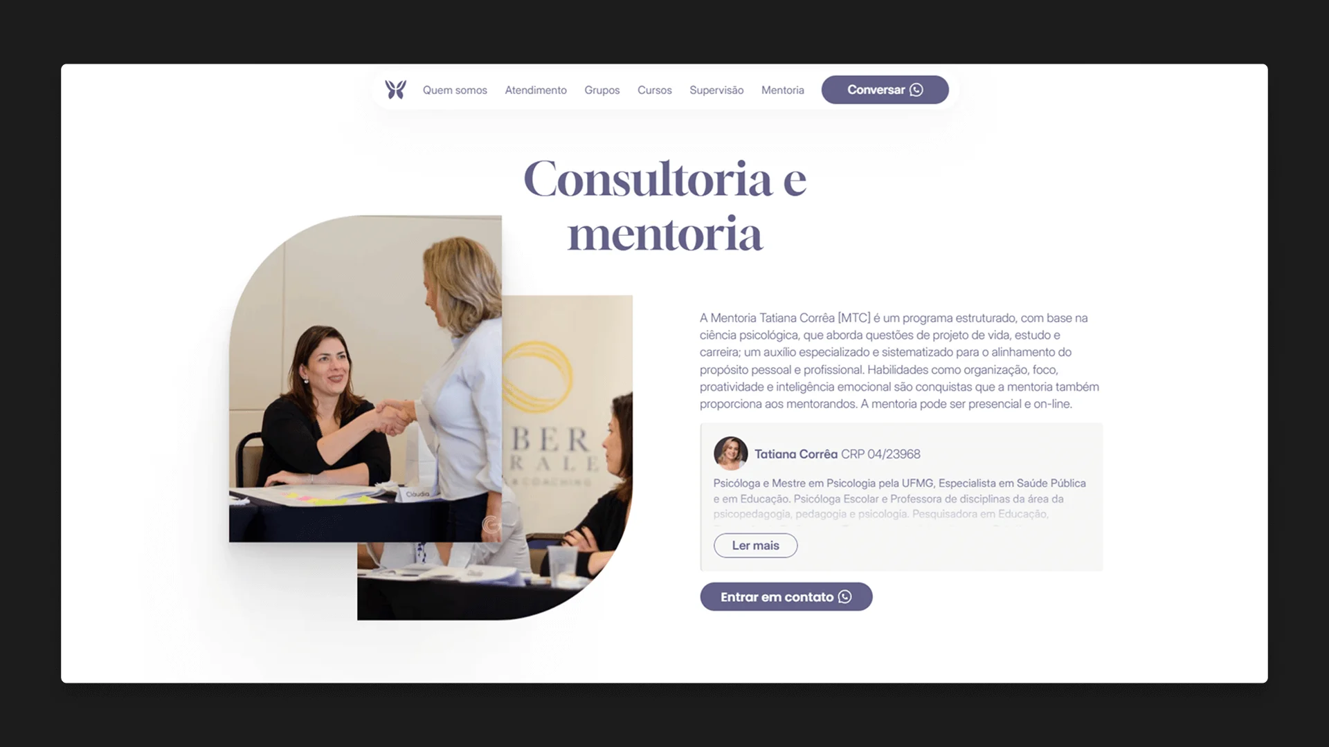 The clean and organized visual design reinforces the project’s values: integration, care, and trust, highlighting the extensive experience of the professionals and supporting the project’s purpose: “For ethical, responsible, and up-to-date mental health care.”